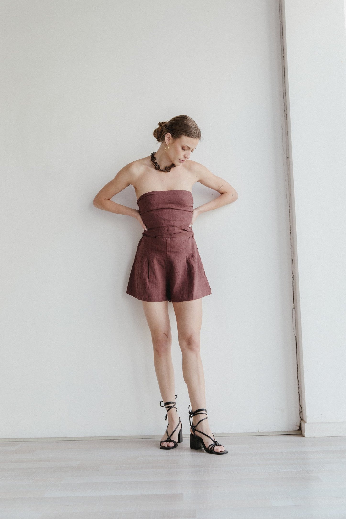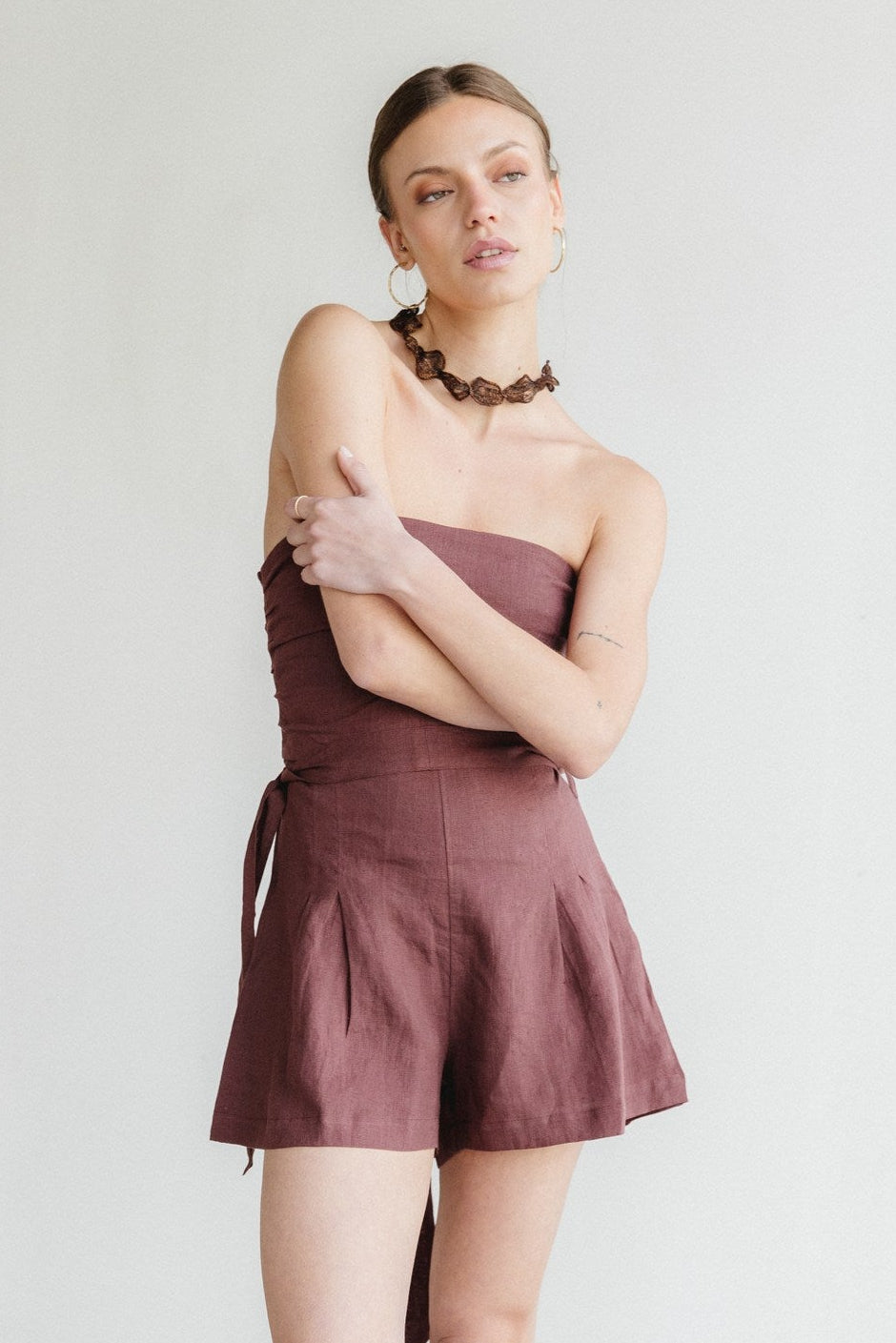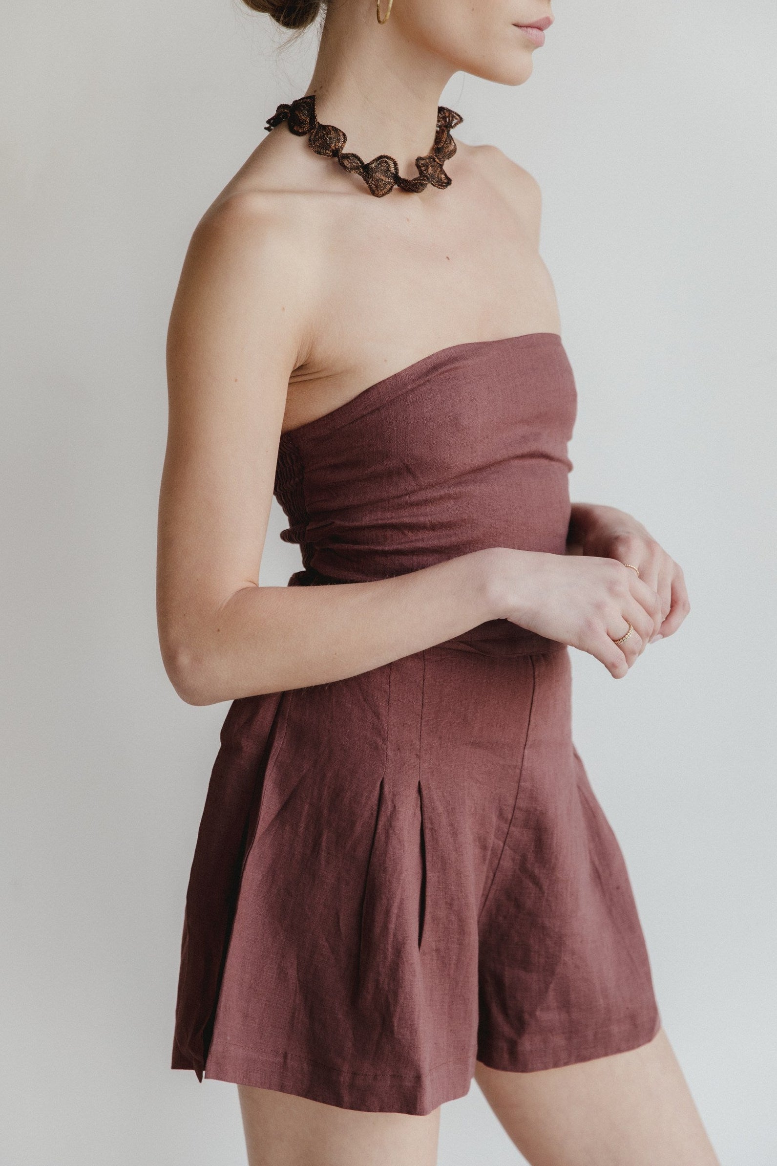 Amor a primera vista. Este enterito, confeccionado en 100% lino con forro de algodón, fue creado para brillar. Es strapless y ajustado al cuerpo gracias a su espalda elástica. Tiene un short amplio y holgado, con un cinturón a la medida que se ajusta para crear una silueta elegante y femenina sin perder la comodidad. Ideal para brillar en un día especial con tus accesorios favoritos o para tu dia a dia con unas hawaianas. Tu decides.