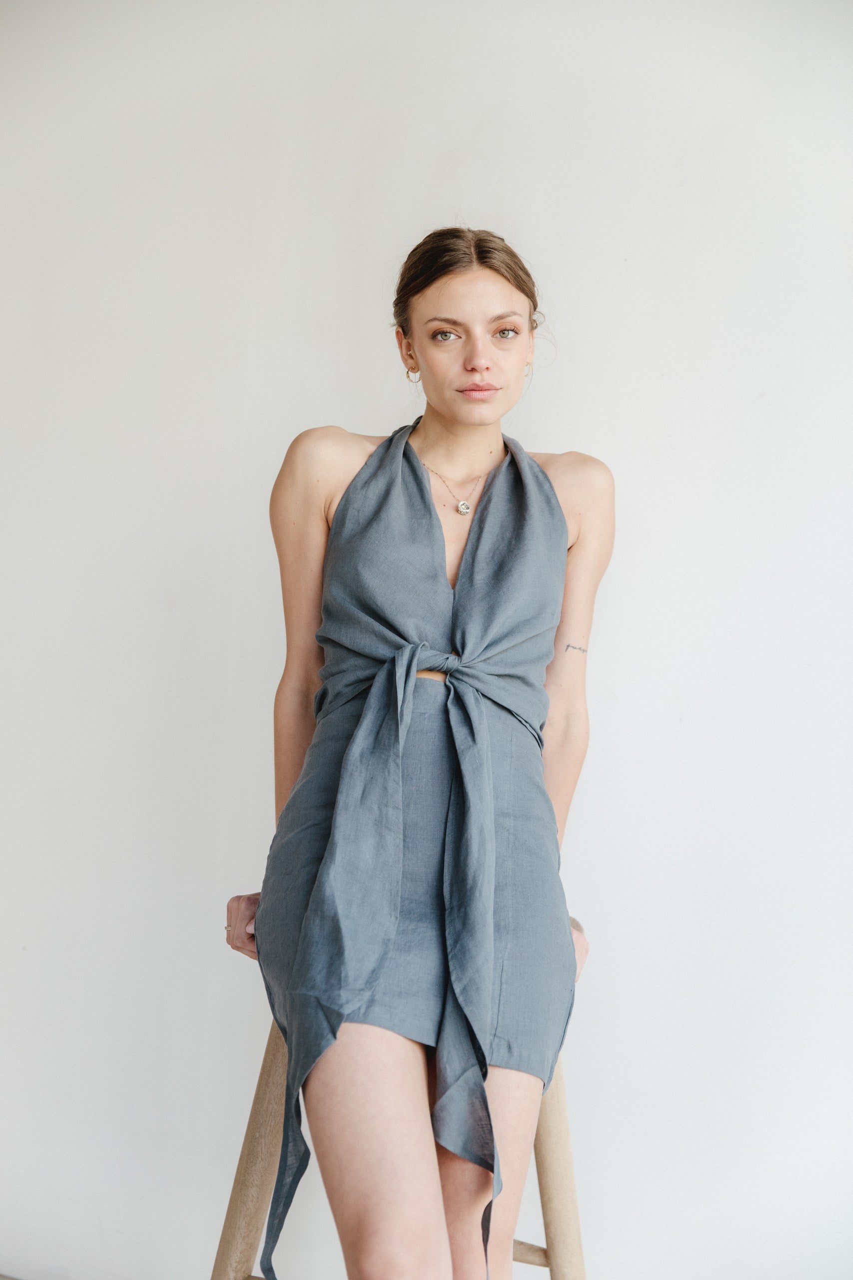 El nuevo favorito de todas las #ChicasAdeu. Nuestro Top Bis es la mezcla perfecta de versatilidad y elegancia. Ajustable al cuello, con una silueta de escote en V, tiene dos lazos con los que puedes jugar, dejándolos caer o ajustándolos al cuerpo para crear un top completamente distinto. Al igual que nuestro famoso Top Río, tiene presillas en la parte trasera que te permiten jugar con la espalda y tener muchas posibilidades distintas con un solo top.