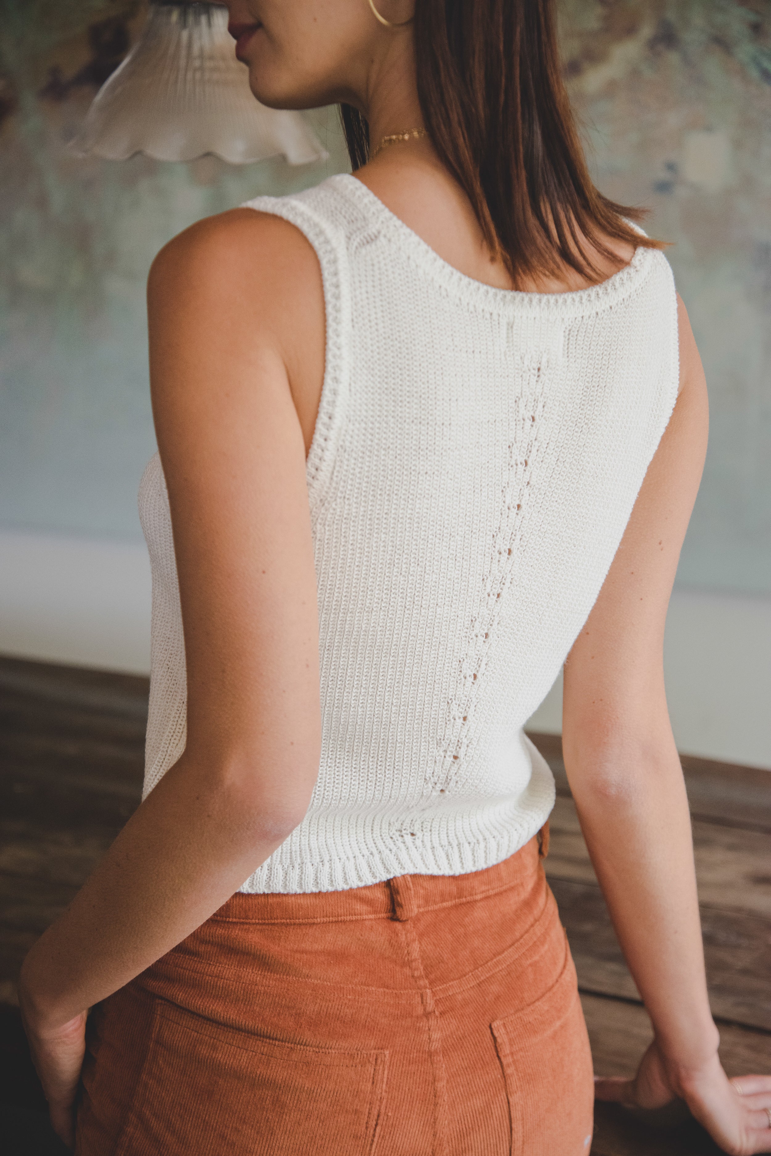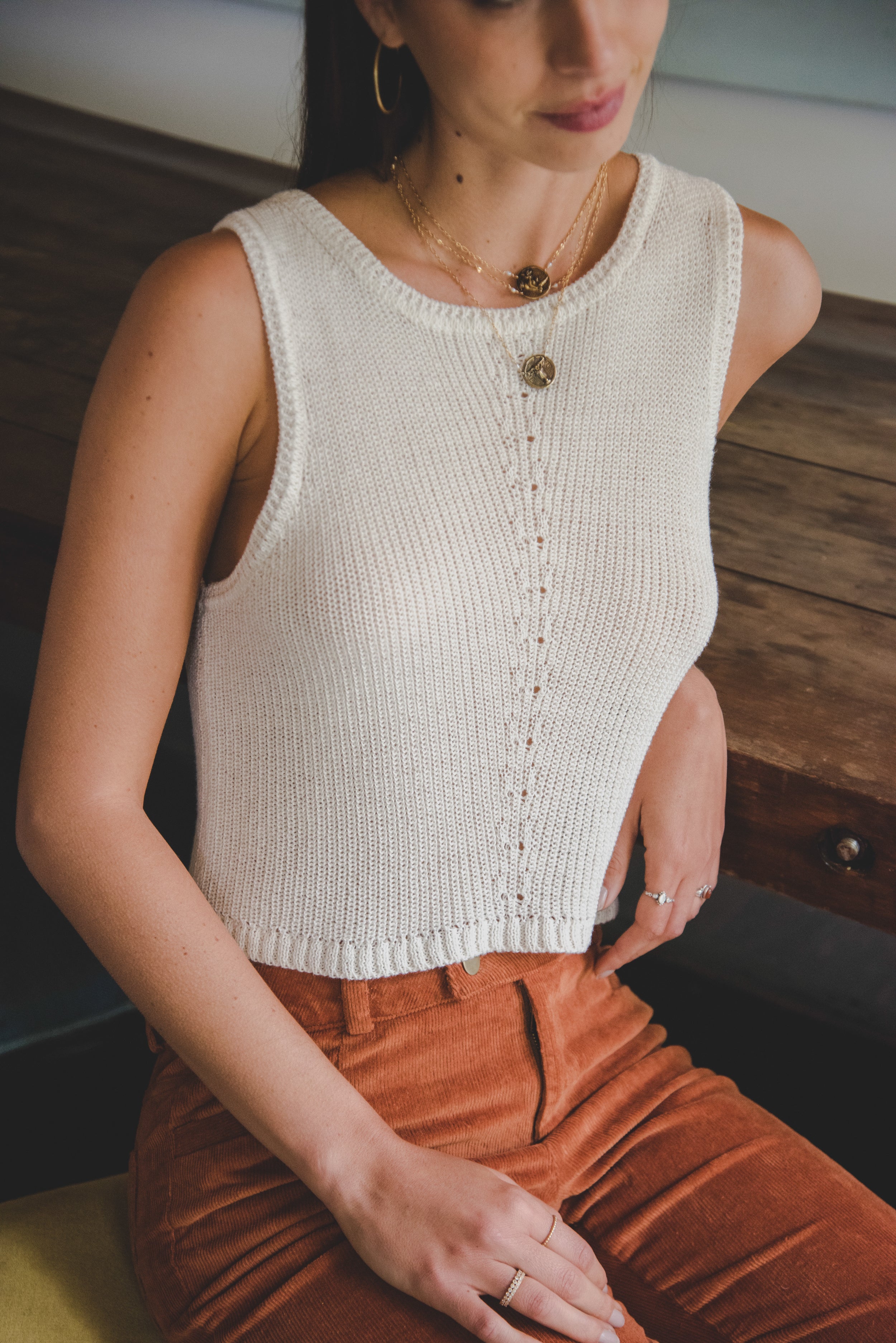 Un top femenino y lleno de detalles, ideal para ocupar con faldas y pantalones de tiro alto. Con una espiga en el centro este top tiene el cuello redondo, diseñado en 100% algodón peruano, con una silueta holgada y cómoda para cualquier ocasión.