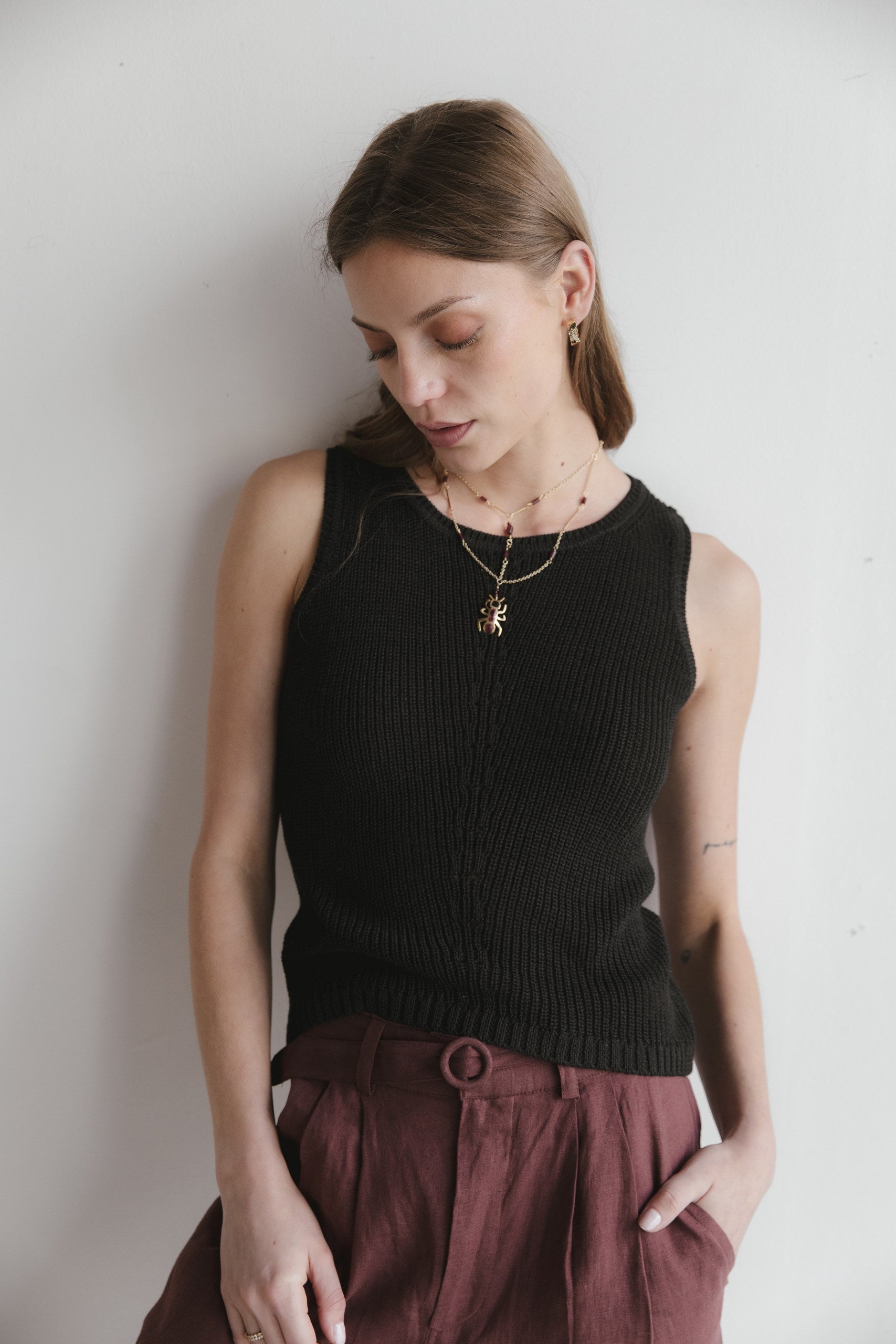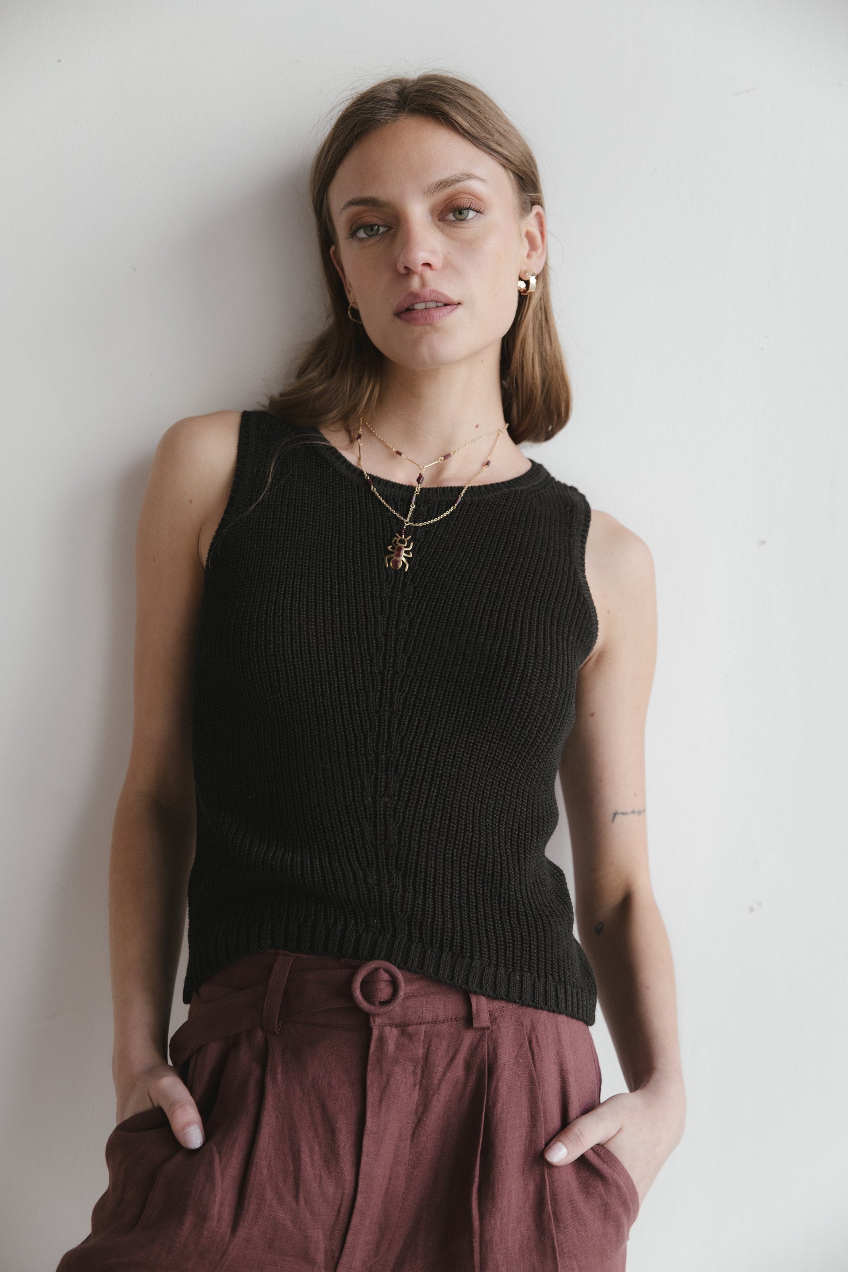 Un top femenino y lleno de detalles, ideal para llevar con faldas y pantalones de tiro alto. Este top tejido en algodón peruano, tiene un detalle de punto especial en el frente, cuello redondo una silueta holgada y es muy cómodo para usarlo todos los días.