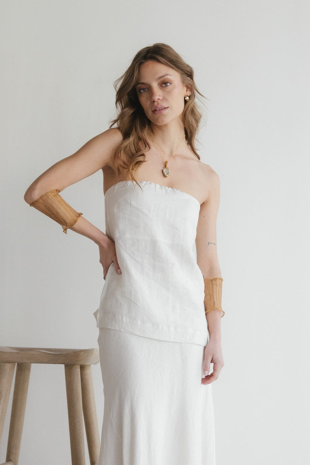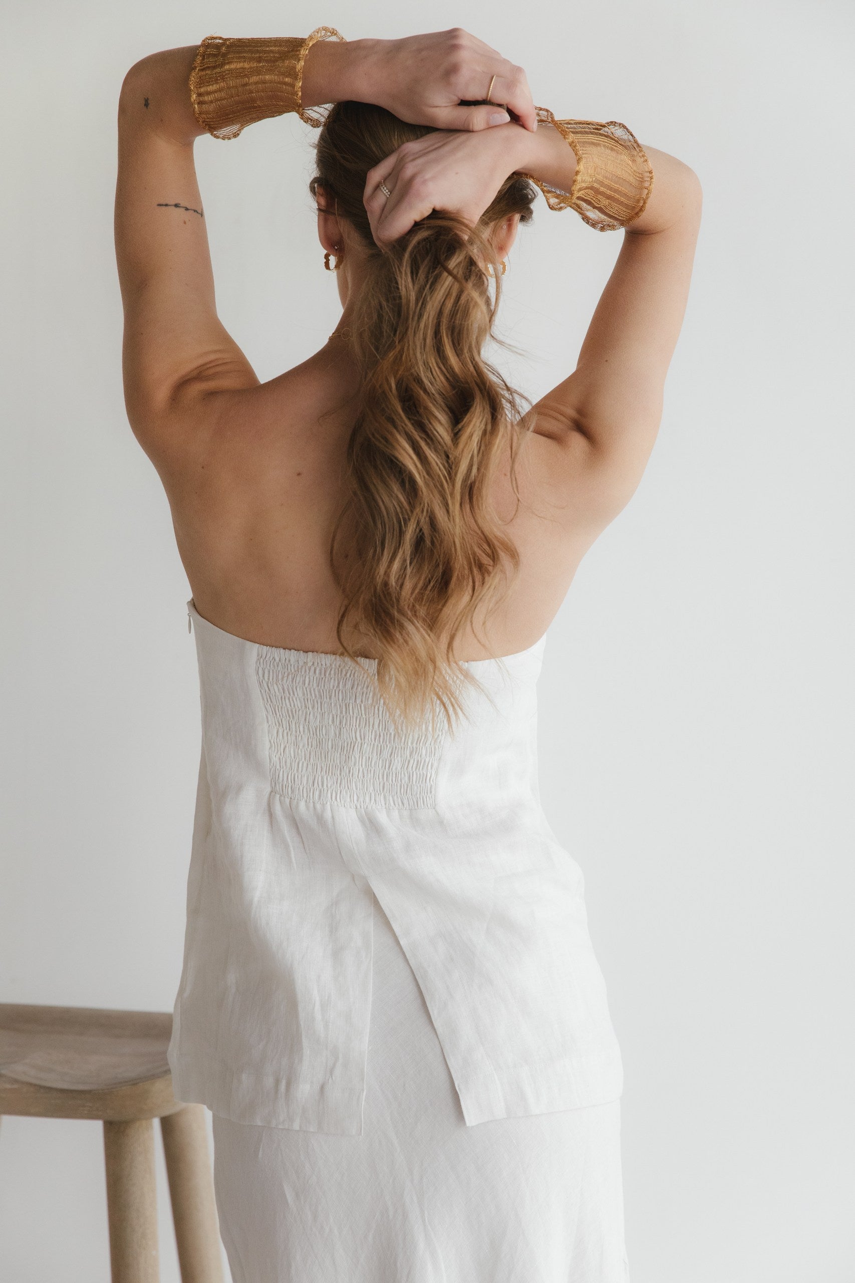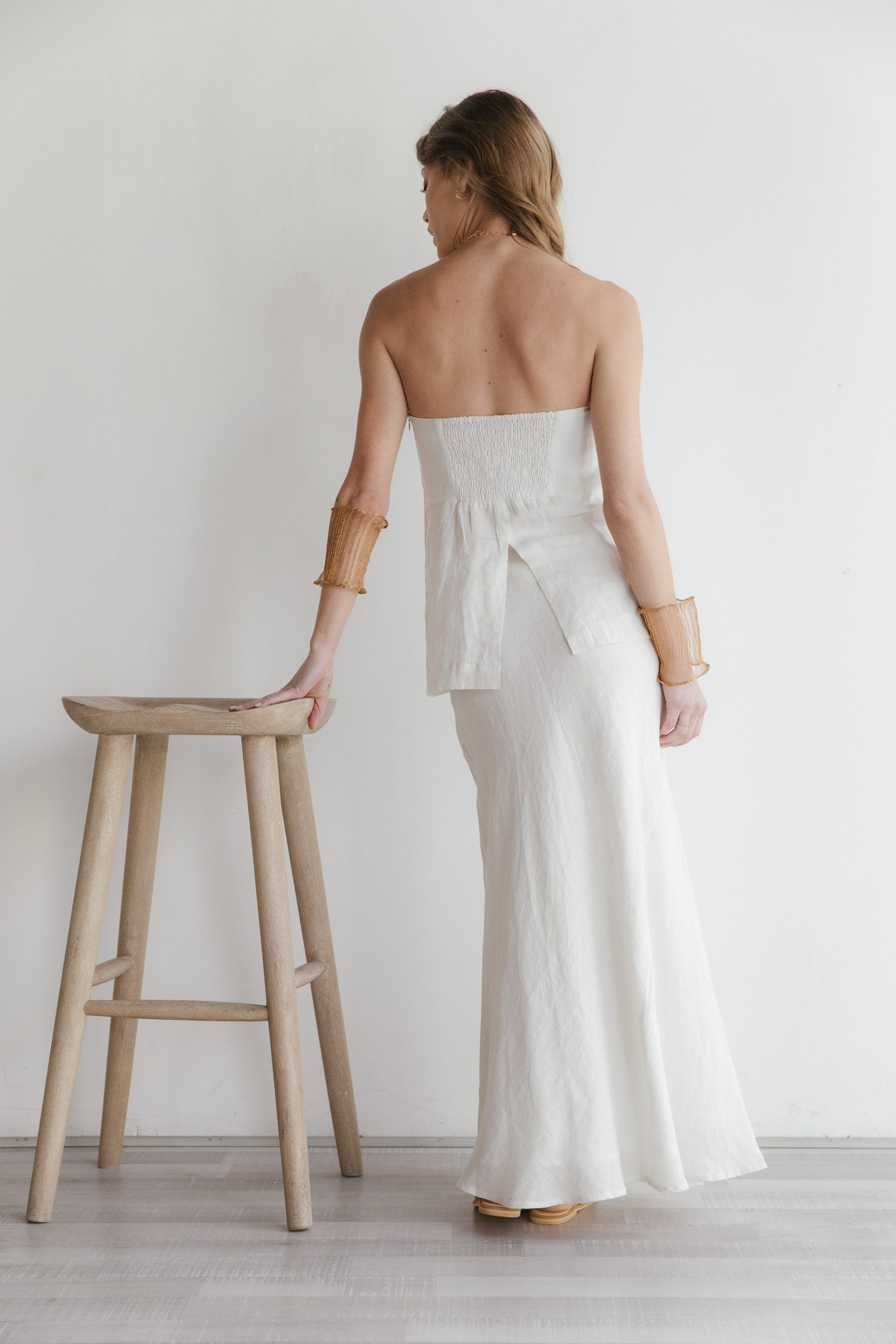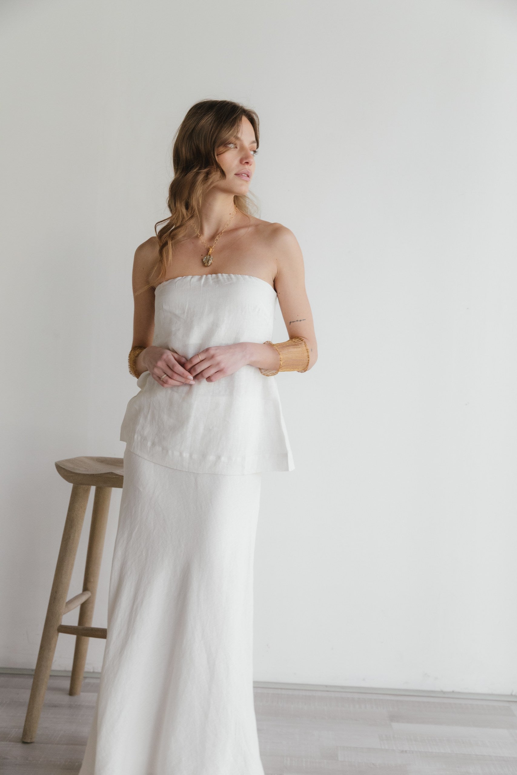 Top strapless confeccionado en 100% lino con forro de algodón, ideal para combinar con pantalones o faldas. De líneas clásicas y diseño minimalista, cuenta con un corte especial en la espalda que aporta movimiento y armoniza con su prenda inferior a juego. Una pieza versátil y elegante, pensada para acompañarte con frescura en los días cálidos.
