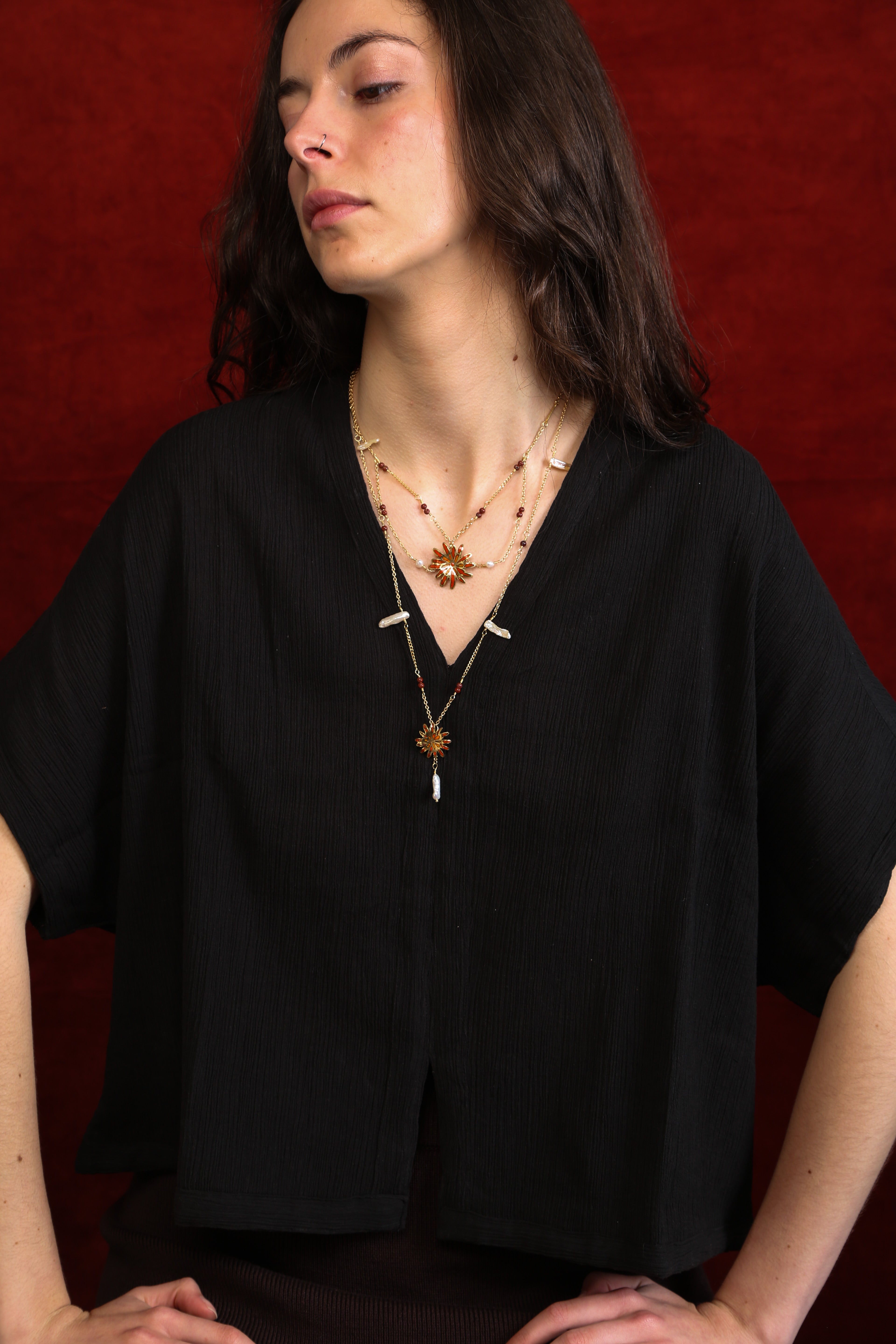 El nuevo Top Uluru, confeccionado en 100% algodón plisado, destaca por su textura única que aporta frescura y personalidad. Con escote en V y mangas tipo murciélago, ofrece una silueta relajada pero sofisticada, ideal para acompañarte en el día a día. Su abertura central en el bajo suma movimiento y un detalle contemporáneo que eleva cualquier look con naturalidad y estilo.